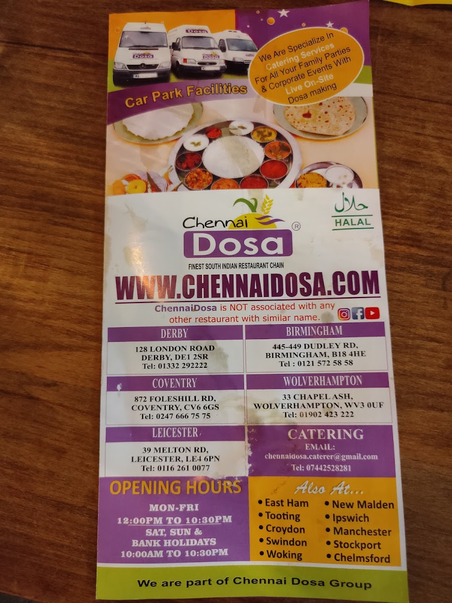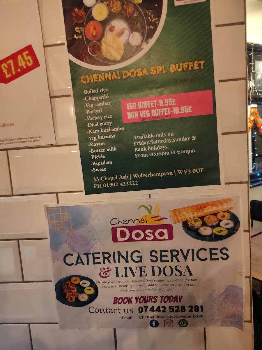Located in the heart of Wolverhampton at 33 Chapel Ash, Chennai Dosa offers a delightful selection of South Indian cuisine. Known for its authentic flavors, the restaurant excels in delivering a rich, aromatic experience that is both satisfying and unique. As you step inside, the inviting atmosphere and friendly service set the stage for a memorable dining experience.